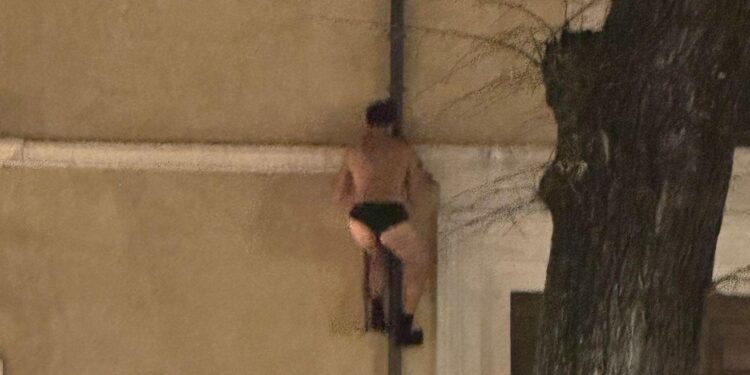Scena surreale nella notte di sabato  nel cuore dell’Aquila, dove un uomo in mutande è stato immortalato mentre scalava la grondaia di un palazzo in piazza Regina Margherita. Le immagini della bravata, circolate rapidamente sui social, hanno suscitato stupore e irritazione tra i residenti.