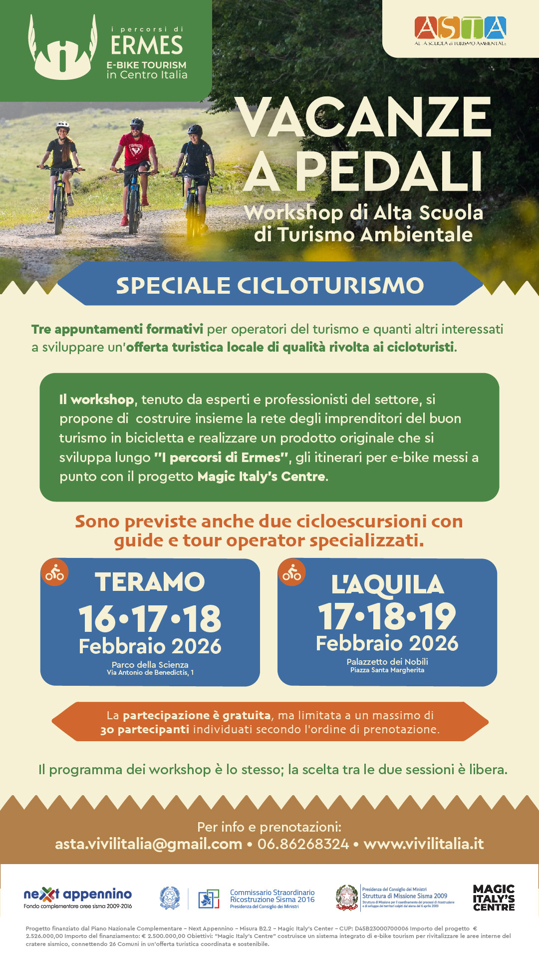 Teramo. Formazione qualificata, costruzione di reti territoriali e valorizzazione dei territori interni: sono questi i pilastri di “Vacanze a Pedali”, il nuovo ciclo di workshop promosso da ASTA – Alta Scuola di Turismo Ambientale nell’ambito del progetto Magic Italy’s Centre. Un’iniziativa che individua nel cicloturismo uno degli asset più dinamici per la rigenerazione economica e sociale del Paese, con particolare attenzione al Centro Italia e ai comuni del cratere sismico.
