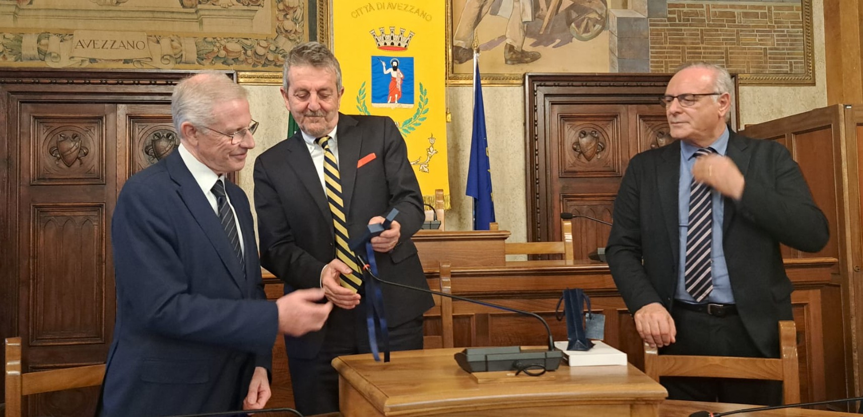 Ad accogliere il Prefetto Vito Cusumano nella sala consiliare, il sindaco ha richiamato il valore simbolico degli affreschi che raccontano la storia della città e del popolo marsicano, sottolineando il carattere e la resilienza di una comunità che nel tempo ha saputo affrontare trasformazioni e difficoltà.