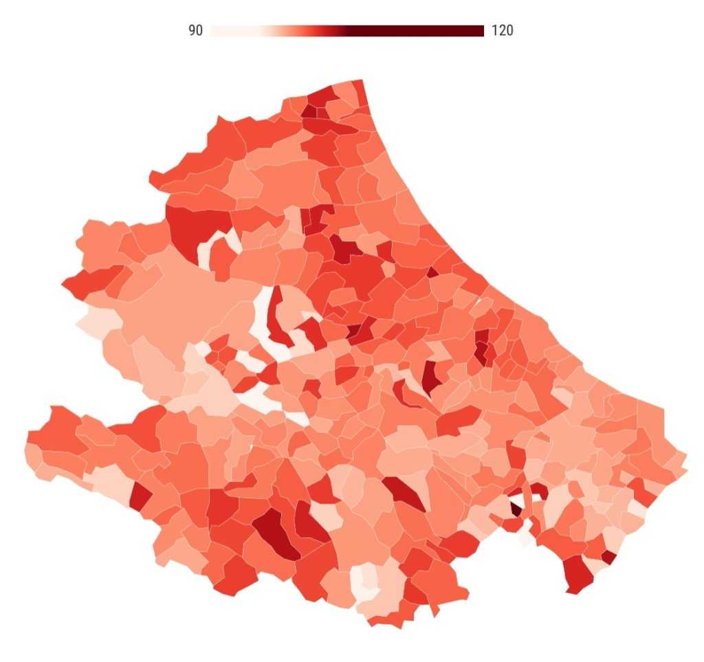 Tra i comuni abruzzesi, il 59% (180 su 305) supera la soglia di 99 dell’indice. I livelli più elevati si raggiungono negli 8 comuni il cui dato supera quota 103. Tra i capoluoghi abruzzesi, Pescara è quello con l’indice più alto (100,56). Seguono Chieti (99,57), Teramo (99,37) e L’Aquila (98,24).